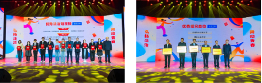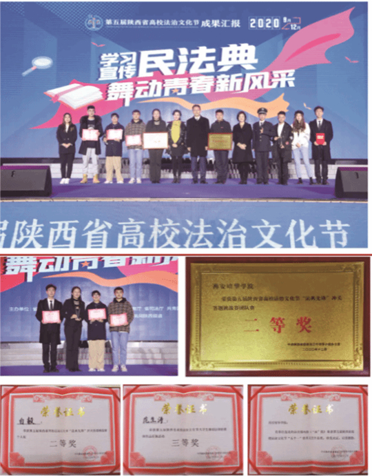 啟動(dòng)儀式上,表彰了陜西省第九屆高校法治文化宣傳季青少年法治短視頻大賽、優(yōu)秀法治文化作品、優(yōu)秀組織單位等獲獎(jiǎng)單位和個(gè)人。西安培華學(xué)院選送的短視頻《第一百八十四條》獲青少年法治短視頻大賽二等獎(jiǎng),《一千五預(yù)算》獲青少年法治短視頻大賽三等獎(jiǎng),學(xué)校榮獲“優(yōu)秀組織單位”獎(jiǎng)。