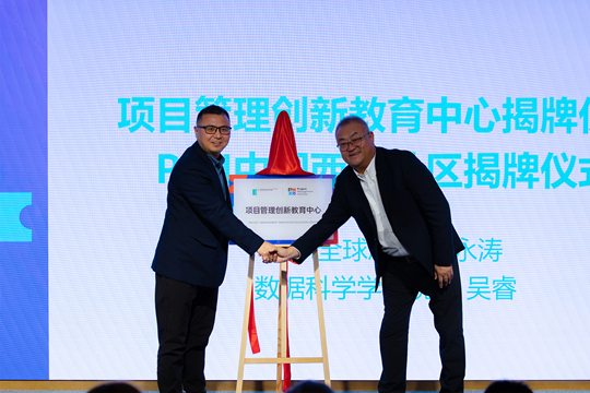 圖2 PMI全球副總裁陳永濤與西安歐亞學院數(shù)據科學學院執(zhí)行院長吳睿為項目管理創(chuàng)新教育中心揭牌