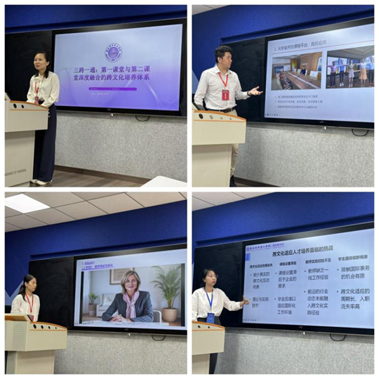 安然教授首先圍繞學(xué)校商科教育模式的“四引擎”機(jī)制——“三跨一通、名校協(xié)同、AI賦能、名企聯(lián)動”進(jìn)行了總體介紹,集中展現(xiàn)了國際商學(xué)院在跨文化教育上的創(chuàng)新探索與實(shí)踐成果。賀夢圓老師聚焦于課堂體系重構(gòu),提出通過第一課堂與第二課堂的深度融合,推動理論與實(shí)踐的雙向貫通,為學(xué)生跨文化能力的提升提供堅(jiān)實(shí)支撐。王金鵬老師針對跨校協(xié)同,展示了利用元宇宙平臺打造沉浸式學(xué)習(xí)空間的新構(gòu)想,強(qiáng)調(diào)數(shù)字化技術(shù)如何突破地域限制,助力跨校與跨境的協(xié)作創(chuàng)新。彭鑫怡老師重點(diǎn)介紹了AI賦能在國際商務(wù)談判教學(xué)中的應(yīng)用,展示了AI平臺如何通過即時(shí)反饋和動態(tài)模擬,幫助學(xué)生增強(qiáng)跨文化敏感度與策略適應(yīng)力。面向校企聯(lián)動,鄒楚、陳賢賢老師結(jié)合實(shí)踐案例,探討了產(chǎn)教融合在跨文化適應(yīng)型人才培養(yǎng)中的新路徑,凸顯了校企協(xié)同的實(shí)際效益與長遠(yuǎn)價(jià)值。
