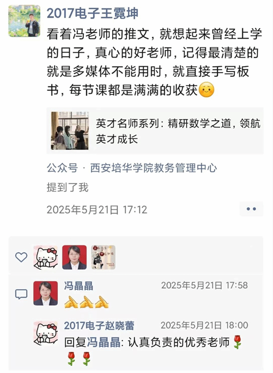 針對(duì)學(xué)習(xí)困難的學(xué)生,馮晶晶建立了專(zhuān)門(mén)的幫扶檔案,定期與學(xué)生談心交流,分享高效學(xué)習(xí)方法,還鼓勵(lì)他們嘗試成為“小老師”。當(dāng)學(xué)生通過(guò)自己的努力向同伴講清知識(shí)點(diǎn)時(shí),那份被點(diǎn)燃的自信與成就感,成為他們主動(dòng)成長(zhǎng)的強(qiáng)大動(dòng)力。這份用心,讓畢業(yè)多年的學(xué)生仍念念不忘——2017級(jí)電子專(zhuān)業(yè)的王霓坤在朋友圈轉(zhuǎn)發(fā)馮晶晶的推文時(shí)寫(xiě)道:“真心的好老師,記得最清楚的就是手寫(xiě)板書(shū),每節(jié)課都是滿滿的收獲!