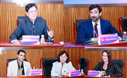 11月13日,秋高氣爽,異木棉花競(jìng)相綻放,由廣州城市理工學(xué)院主辦,國際商學(xué)院和國際交流與合作處承辦,外國語學(xué)院協(xié)辦的2025年國際校企協(xié)同育人論壇在行政樓703報(bào)告廳隆重舉行。本次論壇是廣州城市理工學(xué)院首次主辦全過程使用英語進(jìn)行的國際論壇,展示出學(xué)校日益提升的國際化辦學(xué)水平與搭建高層次國際交流平臺(tái)的能力。論壇以“國際商務(wù)新形勢(shì):探索全球勝任力應(yīng)用型人才培養(yǎng)創(chuàng)新模式”為主題,匯聚了來自葡萄牙、美國、巴基斯坦、印度等國家的專家學(xué)者與企業(yè)領(lǐng)袖,共同探討國際商務(wù)教育創(chuàng)新與全球勝任型人才培養(yǎng)的新路徑。葡萄牙駐廣州總領(lǐng)事館(以下簡(jiǎn)稱總領(lǐng)事館)貿(mào)易與文化事務(wù)高級(jí)官員Mariana Amado da Silva女士、葡萄牙里斯本大學(xué)學(xué)院(以下簡(jiǎn)稱里斯本大學(xué)學(xué)院)Ricardo Paes Mamede教授、JOINCO Import & Export Ltd.(以下簡(jiǎn)稱JOINCO公司)首席執(zhí)行官Pedro Cunha先生、中國區(qū)負(fù)責(zé)人Tiago Mateus先生、廣州市圣瑞吉貿(mào)易有限公司創(chuàng)始人Shyju Thumbrayil先生、廣州瀚卓藥業(yè)有限公司創(chuàng)始人羅文航等嘉賓與近200名師生參加了論壇。學(xué)校副校長劉洊波教授作歡迎致辭,校長蘇成教授作論壇主旨報(bào)告,會(huì)議由國際商學(xué)院院長安然教授主持。