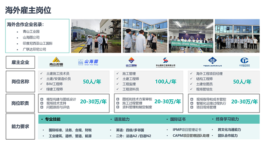 2.搭建國(guó)際化人力資源服務(wù)平臺(tái):該校聯(lián)合深耕東南亞市場(chǎng)8年的北京山海圖科技有限公司,對(duì)接中鐵、中建、中交等20余家基建龍頭企業(yè)海外崗位需求,已為西安歐亞學(xué)院人居環(huán)境學(xué)院2025屆畢業(yè)生成功匹配海外管理崗、技術(shù)崗45個(gè),搭建了學(xué)校連接國(guó)際優(yōu)質(zhì)崗位的橋梁。