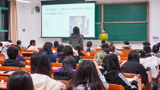 講座以“生活中哪些聲音讓人感到舒適”為切入點,逐步引導師生思考聲音在日常交流與藝術表達中的重要性。湯賀鳳老師圍繞“聲音的價值”與“聲音美容”的內(nèi)涵展開講解,指出聲音作為“第二張臉”和“無形名片”的獨特作用,激發(fā)了師生對聲音訓練的濃厚興趣。她進一步闡釋,朗誦不僅是一種大聲誦讀的語言形式,更是一門融合語言、聲音與表演的綜合藝術,強調(diào)通過準確的聲音表達傳遞作品的情感與思想。