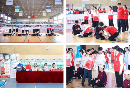 初賽環(huán)節(jié),60支隊伍分4組同步展示“成人心肺復蘇(CPR+AED)”“頭頂部右側出血包扎”“右小腿骨折固定”“右踝關節(jié)扭傷處理”4個科目操作,經(jīng)激烈比拼,16支隊伍晉級下午擇優(yōu)展示環(huán)節(jié)。