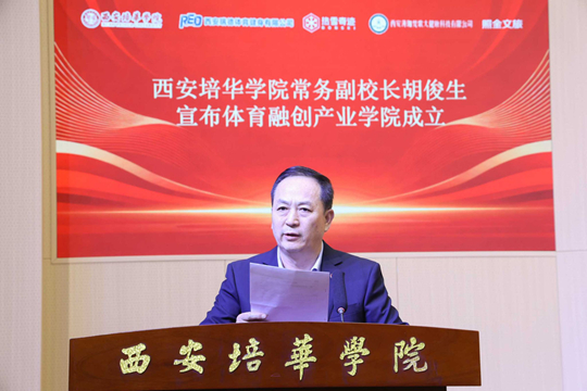 西安培華學(xué)院常務(wù)副校長(zhǎng)胡俊生宣布體育融創(chuàng)產(chǎn)業(yè)學(xué)院正式成立。