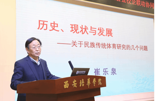 成立儀式后,研討會(huì)圍繞“校企聯(lián)動(dòng)協(xié)同育人”的核心主題展開。國(guó)家體育總局體育文化發(fā)展中心研究員崔樂泉教授以《歷史、現(xiàn)狀與發(fā)展——關(guān)于民族傳統(tǒng)體育研究的幾個(gè)問題》為題,梳理了民族傳統(tǒng)體育的傳承脈絡(luò)與當(dāng)代發(fā)展路徑。