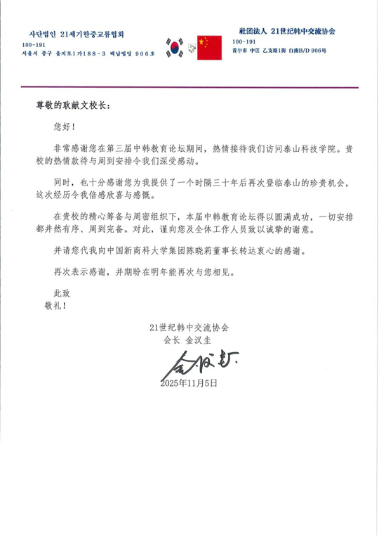 11月5日,泰山科技學(xué)院校長耿獻(xiàn)文收到了21世紀(jì)韓中交流協(xié)會(huì)會(huì)長金漢圭的專門來函,對(duì)第三屆中韓教育論壇——中韓大學(xué)校長論壇的成功舉辦及泰山科技學(xué)院嚴(yán)密的組織工作表示高度贊賞與感謝。