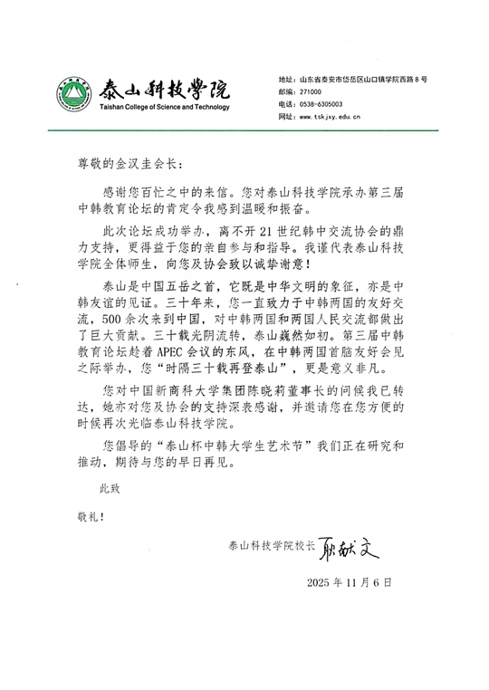 11月6日,泰山科技學(xué)院校長耿獻(xiàn)文回函表示:“從論壇的成功舉辦離不開21世紀(jì)韓中交流協(xié)會(huì)的鼎力支持與金會(huì)長的親自指導(dǎo)!彼仡櫫颂┥阶鳛橹许n友誼象征的文化意義,并強(qiáng)調(diào)金會(huì)長三十年來500余次往返中韓,為兩國交流作出重要貢獻(xiàn)。耿獻(xiàn)文同時(shí)表示,“陳曉莉董事長誠摯邀請金會(huì)長在方便時(shí)再次訪問學(xué)校!