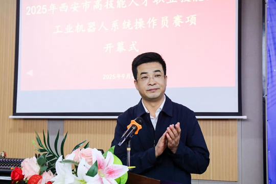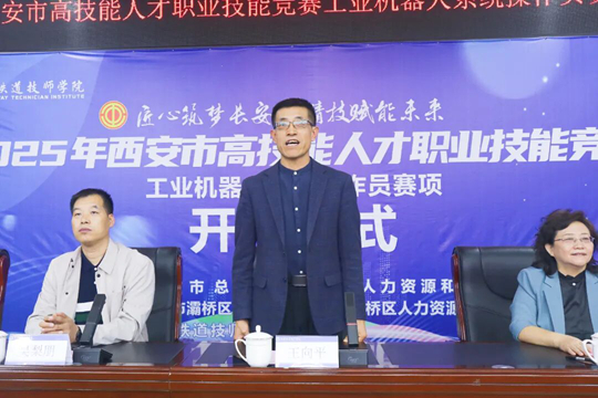 西安鐵道技師學(xué)院黨委書記、校長左永煥致開幕詞,代表學(xué)校對各位領(lǐng)導(dǎo)的支持和信任表示衷心感謝,向大賽組委會(huì)成員、各參賽隊(duì)伍及裁判專家們致以熱烈歡迎。他表示,工業(yè)機(jī)器人作為“新質(zhì)生產(chǎn)力”的核心載體,其技術(shù)應(yīng)用與人才儲(chǔ)備已成為衡量區(qū)域競爭力的關(guān)鍵指標(biāo)。本次競賽以“匠心筑夢長安,精技賦能未來”為主題,聚焦工業(yè)機(jī)器人系統(tǒng)操作員賽項(xiàng),精準(zhǔn)對接《中國制造2025》戰(zhàn)略需求,既是落實(shí)“深化產(chǎn)教融合、強(qiáng)化技能報(bào)國”的實(shí)踐行動(dòng),也是對學(xué)校辦學(xué)辦賽實(shí)力的肯定與檢閱,同時(shí)表示將全力保障賽事,期盼深化合作共譜技能成才新篇章。