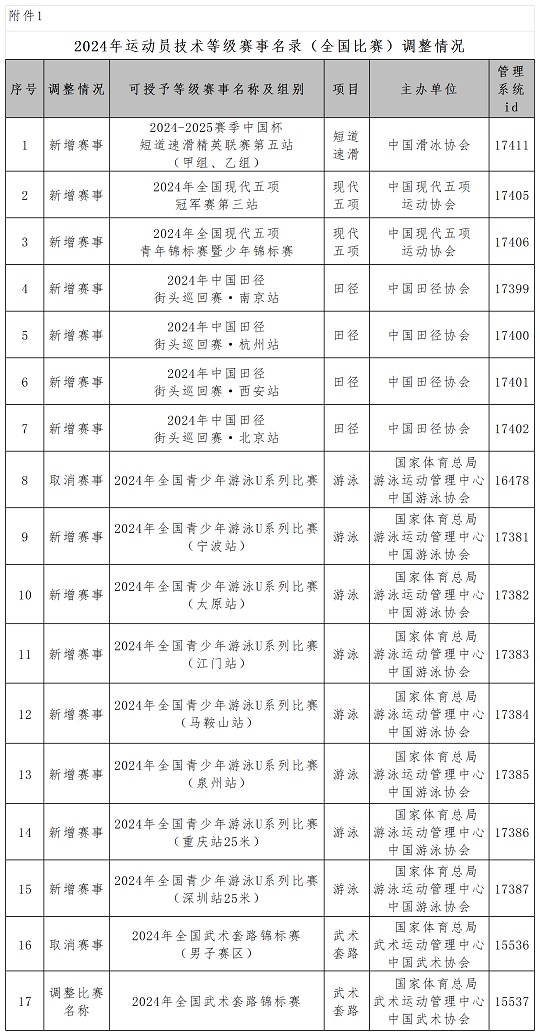 附件:1.2024年運(yùn)動(dòng)員技術(shù)等級(jí)賽事名錄(全國(guó)比賽)調(diào)整情況.pdf點(diǎn)擊查看