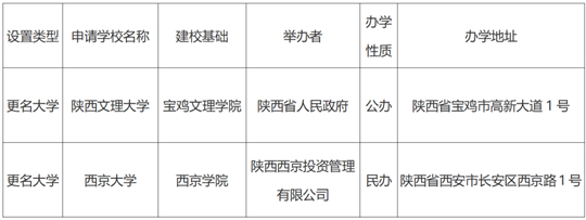 根據(jù)《中華人民共和國高等教育法》《普通高等學(xué)校設(shè)置暫行條例》《普通本科學(xué)校設(shè)置暫行規(guī)定》等有關(guān)規(guī)定,經(jīng)陜西省高等學(xué)校設(shè)置評(píng)議委員會(huì)考察和評(píng)議,現(xiàn)對(duì)擬向教育部申報(bào)的“寶雞文理學(xué)院更名陜西文理大學(xué)”“西京學(xué)院更名西京大學(xué)”事項(xiàng)予以公示,接受社會(huì)監(jiān)督。