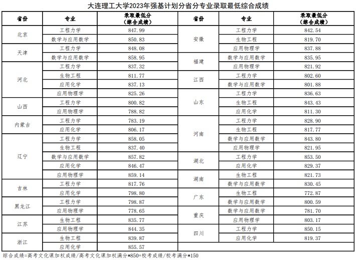 大連理工大學2023年強基計劃分省分專業(yè)錄取最低綜合成績