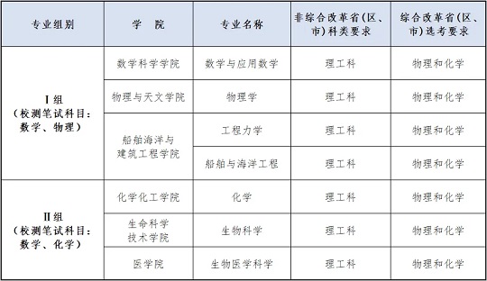 所有按要求完成報(bào)名的考生可參加我校組織的筆試(高考后一周內(nèi)),具體時(shí)間安排詳見準(zhǔn)考證。報(bào)考Ⅰ組的測(cè)試科目為“數(shù)學(xué)、物理”,報(bào)考Ⅱ組的測(cè)試科目為“數(shù)學(xué)、化學(xué)”。我校將根據(jù)筆試成績(jī),按照不超過各。▍^(qū)、市)各專業(yè)組別招生計(jì)劃4倍的比例,分別確定各。▍^(qū)、市)各專業(yè)組別筆試通過考生名單,末位同分考生均予以入圍。未通過筆試的考生不參與后續(xù)環(huán)節(jié)及錄取成績(jī)排序。