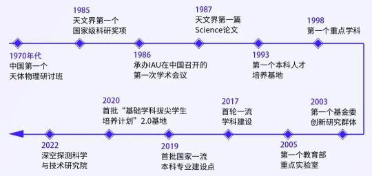2009年,物理(天文)入選全國首批“基礎(chǔ)學(xué)科拔尖學(xué)生培養(yǎng)試驗(yàn)計(jì)劃”,并于2019年入選首批國家“基礎(chǔ)學(xué)科拔尖學(xué)生培養(yǎng)計(jì)劃2.0”基地。2017年入選國家“雙一流”建設(shè)學(xué)科。學(xué)院擁有目前國內(nèi)唯一的天文學(xué)國家一級(jí)重點(diǎn)學(xué)科,天體物理、天體測(cè)量與天體力學(xué)兩個(gè)二級(jí)國家重點(diǎn)學(xué)科,在歷次學(xué)科評(píng)估中均位居國內(nèi)高校天文學(xué)的榜首,領(lǐng)跑中國大學(xué)天文學(xué)科。
