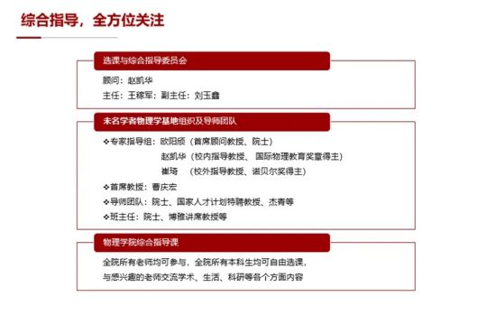 北大物理學(xué)院設(shè)立導(dǎo)師制,全面引導(dǎo)學(xué)生成長,鼓勵有經(jīng)驗的資深教師擔(dān)任本科生的學(xué)業(yè)導(dǎo)師和生活導(dǎo)師,聯(lián)合選課指導(dǎo)委員會、學(xué)工生活導(dǎo)師、資深科研導(dǎo)師、同輩同行計劃等打造全面培養(yǎng)、全面成才模式。