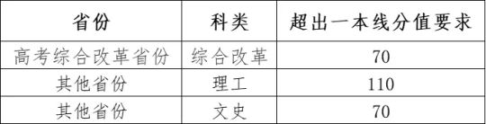 依據(jù)高考成績(不含任何政策加分,下同),按分省分專業(yè)組計劃數(shù)5倍的比例確定入圍學(xué)?己丝忌麊危┪煌志扇雵腋呖汲煽冺氝_(dá)到生源所在省份同科類本科第一批次錄取控制分?jǐn)?shù)線(簡稱一本線,對于合并本科批次的省份,按照該省份單獨(dú)劃定的相應(yīng)分?jǐn)?shù)線執(zhí)行)上一定分值: