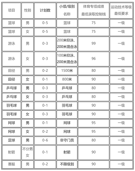。ㄒ唬┛忌捏w育專項(xiàng)考試成績(jī)不得低于各招生項(xiàng)目(部分項(xiàng)目分男女)的體育專項(xiàng)成績(jī)最低錄取控制線。