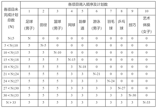 (四)我校各專業(yè)在項(xiàng)目二志愿錄取未完成的情況下,將進(jìn)行計(jì)劃調(diào)整,剩余的招生計(jì)劃將優(yōu)先調(diào)整至我校重點(diǎn)發(fā)展的足球(男子)、田徑、籃球(男子)、網(wǎng)球、跆拳道、游泳(男子)、羽毛球、乒乓球、技巧、藝術(shù)體操(女子)項(xiàng)目。其中,足球按照綜合分由高到低排序,不再分小項(xiàng);技巧項(xiàng)目按照綜合分由高到低排序,不再分性別。各項(xiàng)目調(diào)入順序及計(jì)劃數(shù)安排如下: