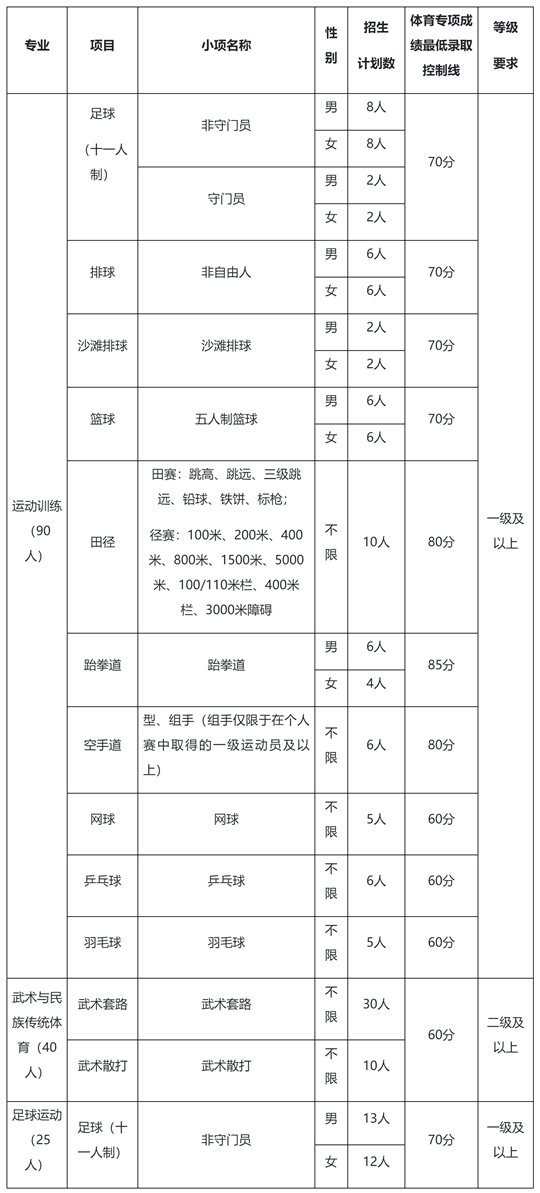 運(yùn)動(dòng)訓(xùn)練專業(yè)計(jì)劃擬招收90人,武術(shù)與民族傳統(tǒng)體育專業(yè)計(jì)劃擬招收40人,足球運(yùn)動(dòng)專業(yè)計(jì)劃擬招收25人,合計(jì)155人(含保送錄取運(yùn)動(dòng)員),正式計(jì)劃以上級(jí)主管部門審批計(jì)劃數(shù)為準(zhǔn)。
