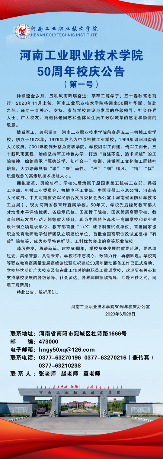 河南工業(yè)職業(yè)技術(shù)學(xué)院50周年校慶公告(第一號(hào))