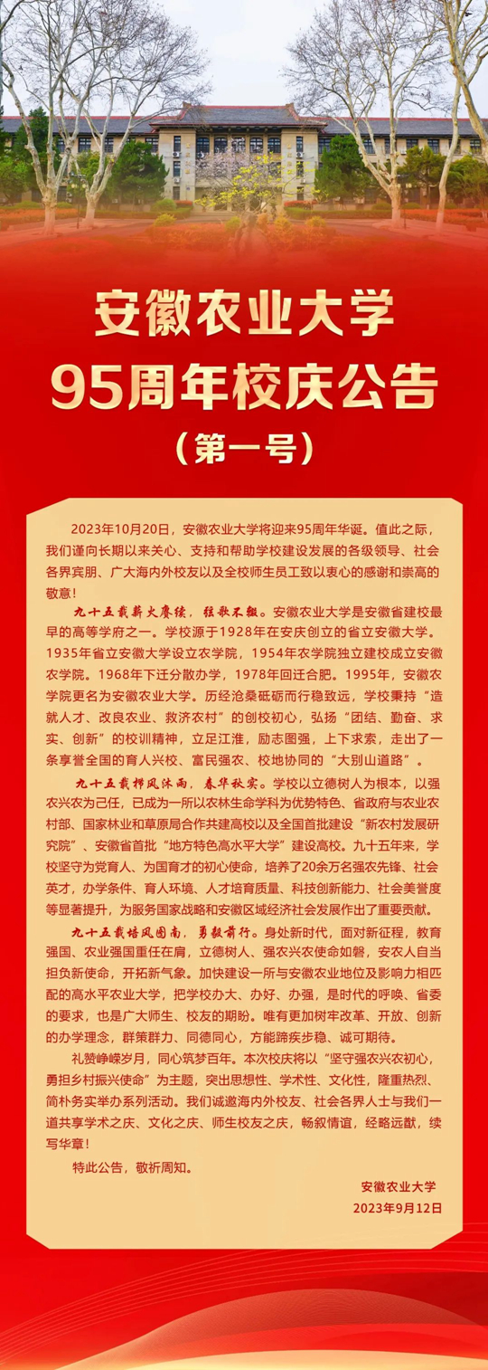 安徽農(nóng)業(yè)大學(xué)95周年校慶公告(第一號)