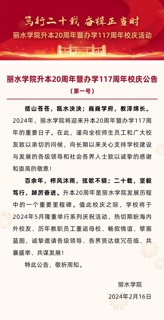 麗水學(xué)院升本20周年暨辦學(xué)117周年校慶公告