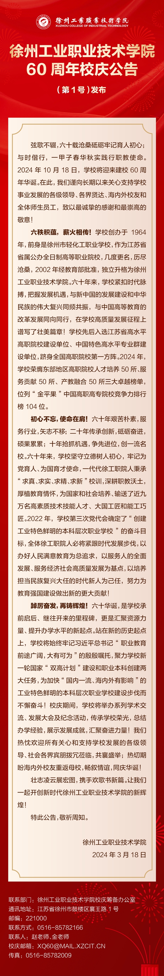 徐州工業(yè)職業(yè)技術(shù)學(xué)院60周年校慶公告(第1號)