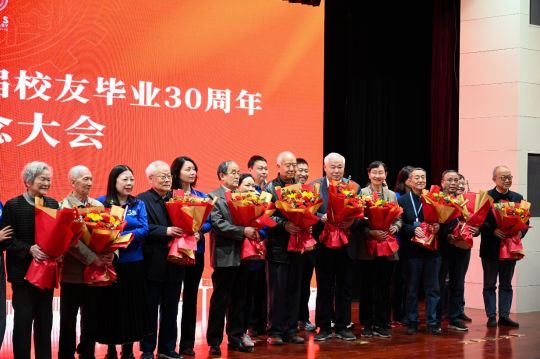 部分校友代表為老教師獻(xiàn)花,感謝老師們的辛勤付出和悉心教導(dǎo)。