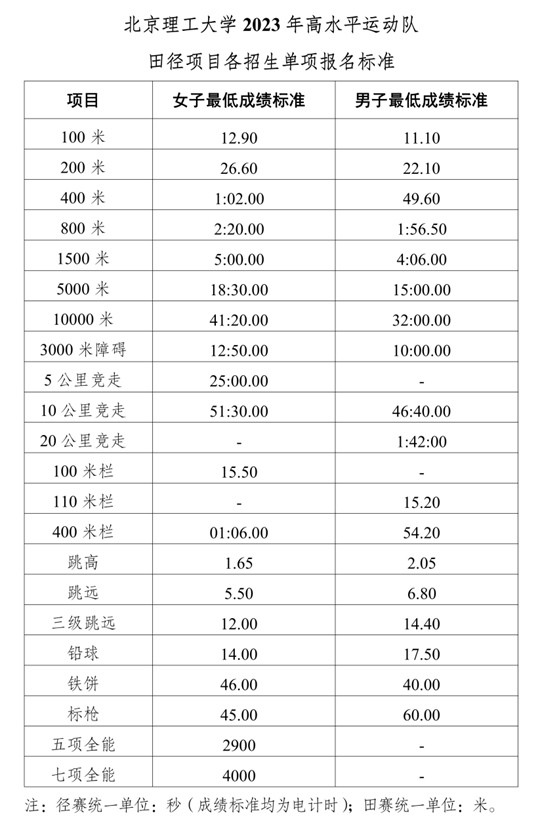 注:報(bào)考我校田徑項(xiàng)目的考生報(bào)名提供的參賽成績(jī)需達(dá)到我校田徑項(xiàng)目報(bào)名標(biāo)準(zhǔn)(見(jiàn)下表);報(bào)名時(shí),田徑項(xiàng)目的考生必須明確填報(bào)小項(xiàng),男子足球項(xiàng)目的考生必須明確填報(bào)場(chǎng)上位置,武術(shù)項(xiàng)目的考生必須明確填報(bào)測(cè)試套路分項(xiàng)。