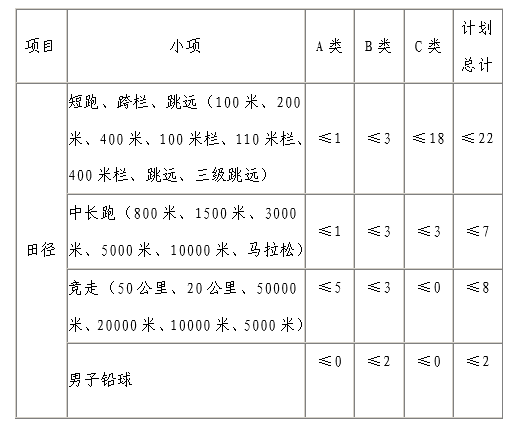 4.某一項目、某一優(yōu)惠等級符合認定要求的人數(shù)不足時,將該項目未完成計劃按照以下流程進行分配:同一優(yōu)惠等級未完成計劃按照競走、中長跑、短跨跳、男子鉛球的順序依次遞補;仍未完成計劃轉(zhuǎn)化為C類后計劃按照本項目組,競走、中長跑、短跨跳、男子鉛球的順序依次遞補。