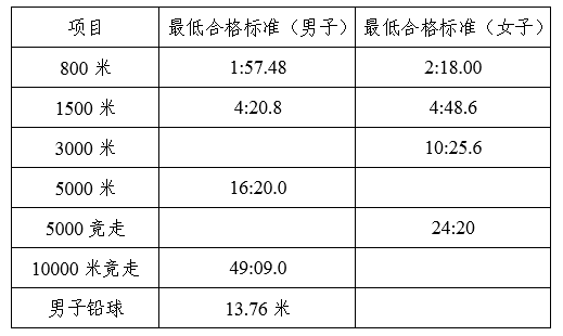 持有馬拉松跑、男女子10000米和女子5000米等級證的考生,在我校專業(yè)測試中男子測試項目為5000米,女子測試項目為3000米。持有男子女子50公里和20公里競走等級證的考生,在我校專業(yè)測試中男子測試項目為10000米競走,女子測試項目為5000米競走。
