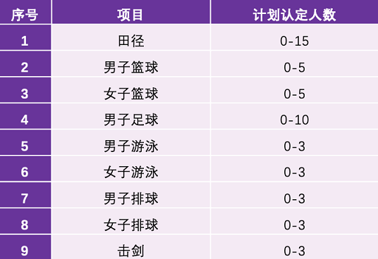 高水平運(yùn)動(dòng)隊(duì)招生計(jì)劃嚴(yán)格按照教育部的有關(guān)規(guī)定執(zhí)行,各項(xiàng)目計(jì)劃認(rèn)定并公示的人數(shù)為: