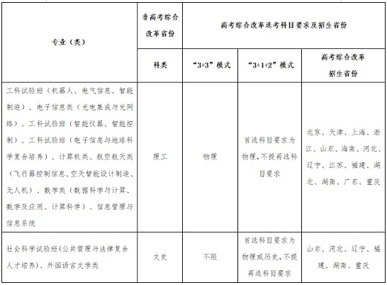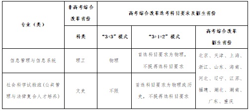 3.各招生專業(yè)(類)名稱及選考科目要求以生源省份省級(jí)招生考試機(jī)構(gòu)公布為準(zhǔn)。實(shí)施高考綜合改革省份(北京、天津、河北、遼寧、上海、江蘇、浙江、福建、山東、湖北、湖南、廣東、海南、重慶)考生不區(qū)分文理,但考生選考科目須符合所報(bào)專業(yè)(類)對(duì)選考科目的要求。