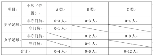 注:女足B類中守門員名額空缺時(shí),遞補(bǔ)給B類非守門員位置;