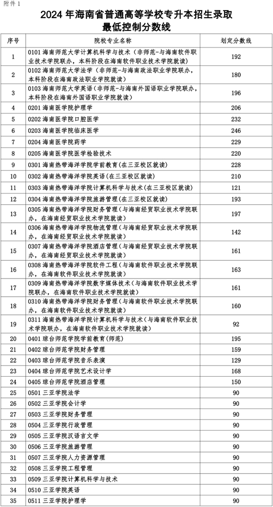 附件:1.2024年海南省普通高等學(xué)校專升本招生錄取最低控制分?jǐn)?shù)線