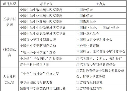 。ㄒ唬└傎愵悾焊咧须A段參加全國中學(xué)生五項學(xué)科競賽(數(shù)學(xué)、化學(xué)、物理、生物、信息學(xué))獲得省級賽區(qū)三等獎及以上;或者科技類、人文社科類競賽(競賽項目詳見附件1)獲得省級賽區(qū)一等獎及以上。