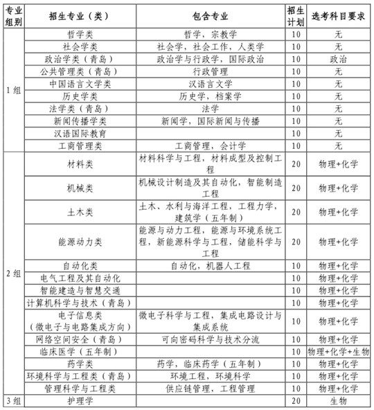 注1:考生只能報(bào)考其中一個(gè)組別的專(zhuān)業(yè),最多可報(bào)6個(gè)專(zhuān)業(yè)志愿,并可選擇是否服從專(zhuān)業(yè)調(diào)劑(同組內(nèi)調(diào)劑);根據(jù)生源情況,各專(zhuān)業(yè)招生計(jì)劃可適當(dāng)調(diào)整;最終招生專(zhuān)業(yè)及計(jì)劃以山東省教育招生考試院公布為準(zhǔn)。