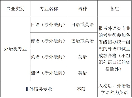 學(xué)校本科招生專業(yè)對入學(xué)外語考試的語種要求為:
