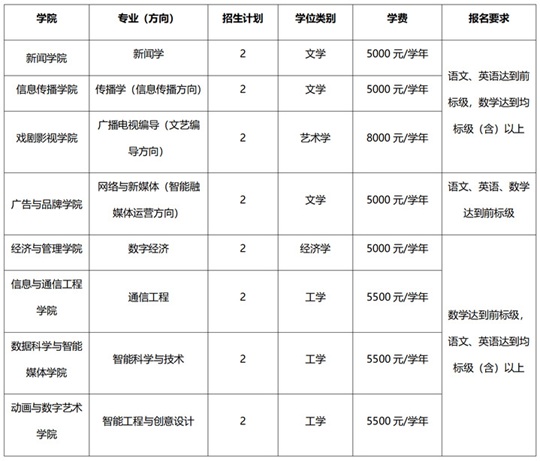 3. 本簡章公布的招生專業(yè)是我校目前的本科專業(yè)設(shè)置,最終錄取專業(yè)以我校2026年本科招生計劃公布的專業(yè)名稱為準。專業(yè)介紹詳見中國傳媒大學本科招生網(wǎng),網(wǎng)址: