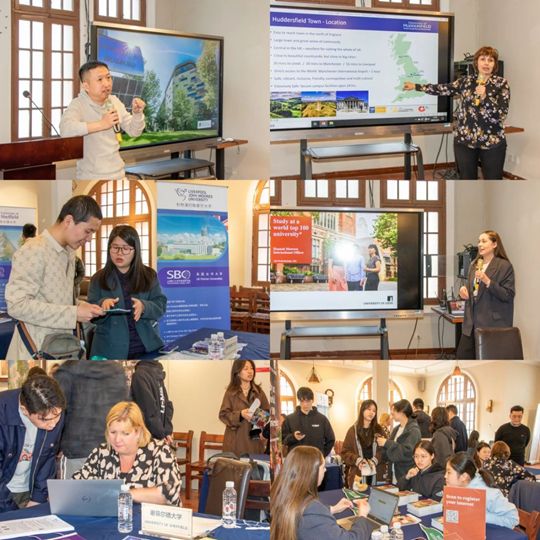 來自布拉德福德大學(xué)、哈德斯菲爾德大學(xué)、利物浦約翰摩爾大學(xué)、利茲大學(xué)和謝菲爾德大學(xué)的代表為在場學(xué)生詳細(xì)介紹了各合作大學(xué)的升學(xué)政策、教育體系、獎學(xué)金項(xiàng)目、特色專業(yè)、就業(yè)前景、文化差異以及學(xué)生支持服務(wù)等方面;顒蝇F(xiàn)場還設(shè)置了資料展臺,同學(xué)們可以領(lǐng)取宣傳冊和申請指南,幫助他們選擇適合自己的學(xué)術(shù)深造方向,順利開啟海外學(xué)習(xí)之旅,為未來的職業(yè)發(fā)展奠定堅實(shí)基礎(chǔ)。隨后,合作大學(xué)代表團(tuán)與同學(xué)們進(jìn)行了面對面交流,圍繞院校選擇、職業(yè)規(guī)劃、海外學(xué)習(xí)生活等多個方面,耐心解答了同學(xué)們關(guān)心的問題。