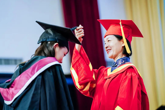 學(xué)位授予儀式上,中英國(guó)際學(xué)院黨委副書(shū)記、副院長(zhǎng)(主持行政工作)、代理執(zhí)行院長(zhǎng)張崢宣讀畢業(yè)生名單。中英雙方院校領(lǐng)導(dǎo)為畢業(yè)生撥穗正冠、握手勉勵(lì),并與畢業(yè)生合影留念。