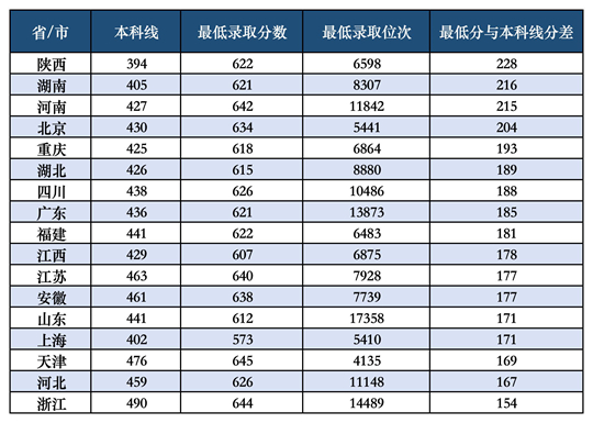所有招生省市的錄取分數(shù)線均超過對應省市本科批次錄取線150分以上,平均分差為186分,達到歷年最高水平;在17個省市的最低錄取分數(shù)與學校普通批(物理類)最低錄取分數(shù)差額均值為23分,較2024年縮小2分,達到歷年最高水平。