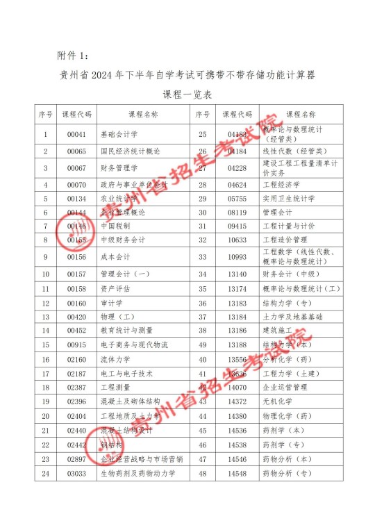 詳情請(qǐng)查看附件1:《貴州省2024年下半年自學(xué)考試可攜帶不帶存儲(chǔ)功能計(jì)算器課程一覽表》。