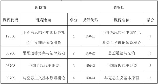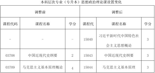 一、自2025年起,在現(xiàn)行各開考專業(yè)計劃中設(shè)置“習近平新時代中國特色社會主義思想概論”(課程代碼15040)課程。調(diào)整后的高等教育自學考試本?茖哟螌I(yè)思想政治理論課均設(shè)置3門課程,共9學分,調(diào)整前后的課程設(shè)置變化如下表所示。