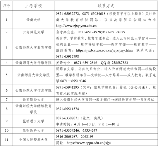 七、云南省高等教育自學考試各專業(yè)實踐性環(huán)節(jié)考核、論文答辯聯(lián)系方式:
