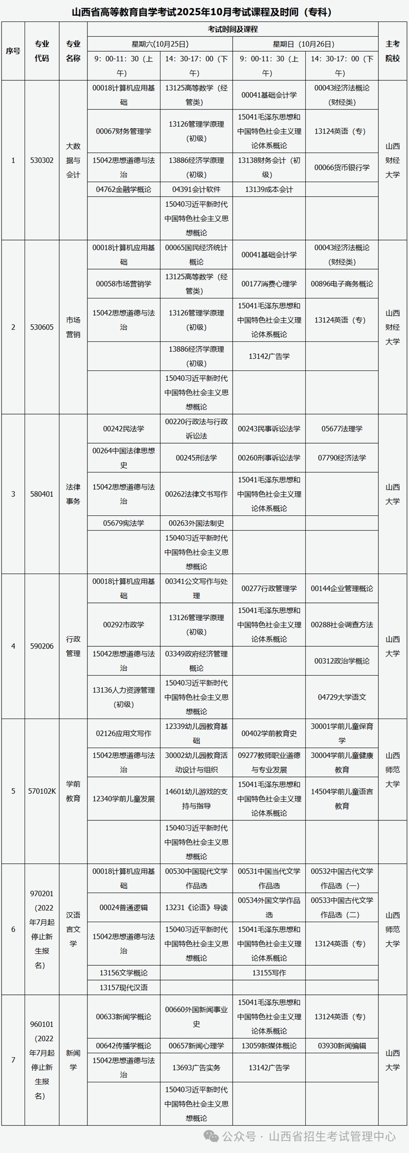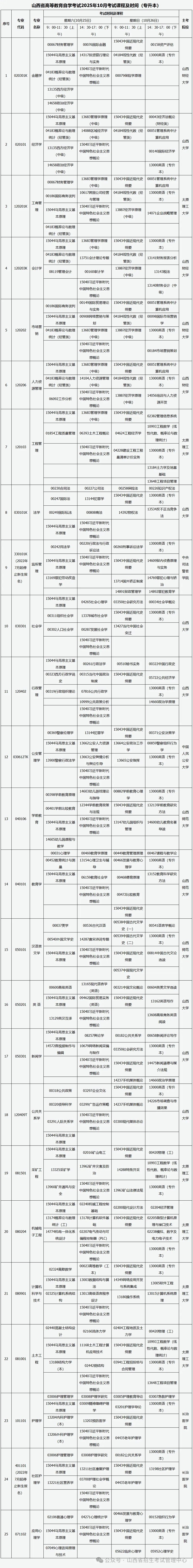 山西省高等教育自學(xué)考試2025年10月考試課程及時間