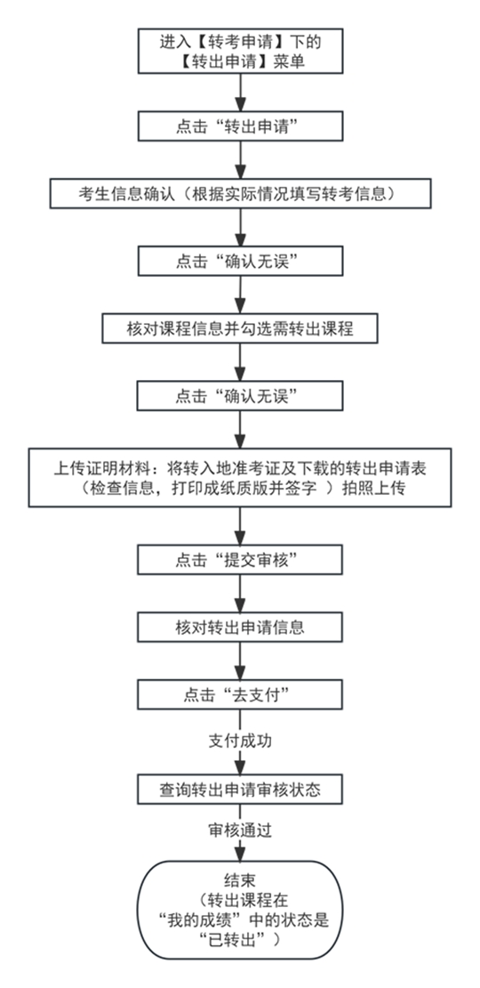 考生提交轉(zhuǎn)出申請并交費確認后,考生的轉(zhuǎn)考電子檔案將統(tǒng)一通過國家轉(zhuǎn)考平臺轉(zhuǎn)出,轉(zhuǎn)出目的省市是否接收及審核結(jié)果一般可于申請當(dāng)月月底公布?忌赏ㄟ^“自考考生服務(wù)平臺”—“轉(zhuǎn)考申請”—“轉(zhuǎn)出申請”查詢結(jié)果。