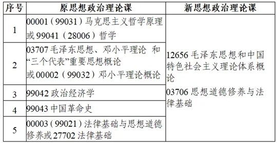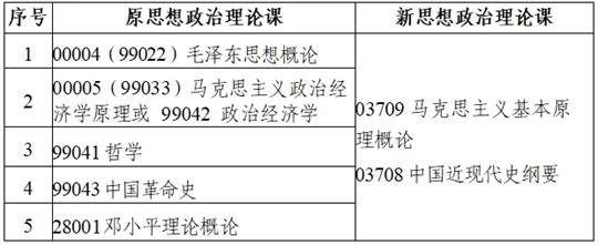 凡在?茖I(yè)中通過序號(hào)1-5中任意兩門的,不需參加新思想政治理論課的考試。僅通過序號(hào)1-4中任意一門課程的,須參加“03706思想道德修養(yǎng)與法律基礎(chǔ)”課程的考試;僅通過序號(hào)5課程的,須參加“12656毛澤東思想和中國特色社會(huì)主義理論體系概論”課程的考試。