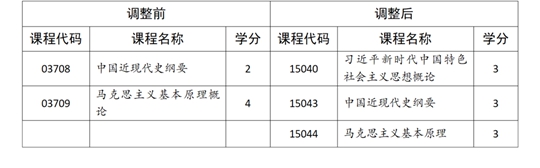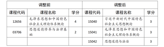調(diào)整后高等教育自學(xué)考試本?茖哟螌I(yè)的思想政治理論課均設(shè)置3門課程,共9學(xué)分,調(diào)整前后的變化如表所示。