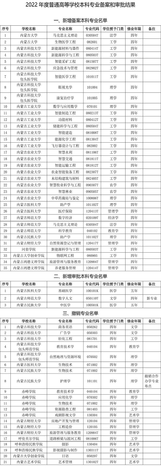 | 內(nèi)蒙古:12所本科高校新增本科專業(yè)38個 教育部公布2022年度普通高等學校本科專業(yè)備案和審批結(jié)果 |